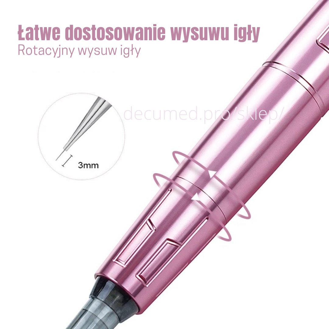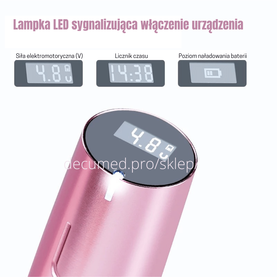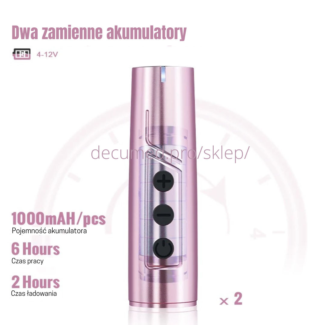 Bezprzewodowe urządzenie do makijażu permanentnego z dwoma wymiennymi akumulatorami. Smukła rączka i aluminiowa obudowa zapewnia niezwykle cichą pracę z niskim poziomem wibrazji.
